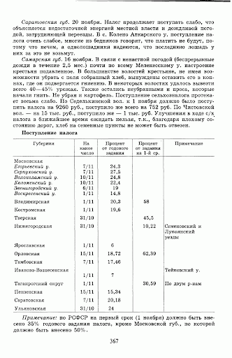 Московская губ. 14 ноября. В дер. Свобода Никольской вол. Воскресенского у. зажиточный крестьянин Рылов агитирует за неуплату налога, говоря, что налог идет на содержание чиновников и коммунистов. В Завидовской вол. Клинского у. [в] дер. Минино на сельском собрании член райсельсовета Шалаев вел агитацию за неуплату налога.